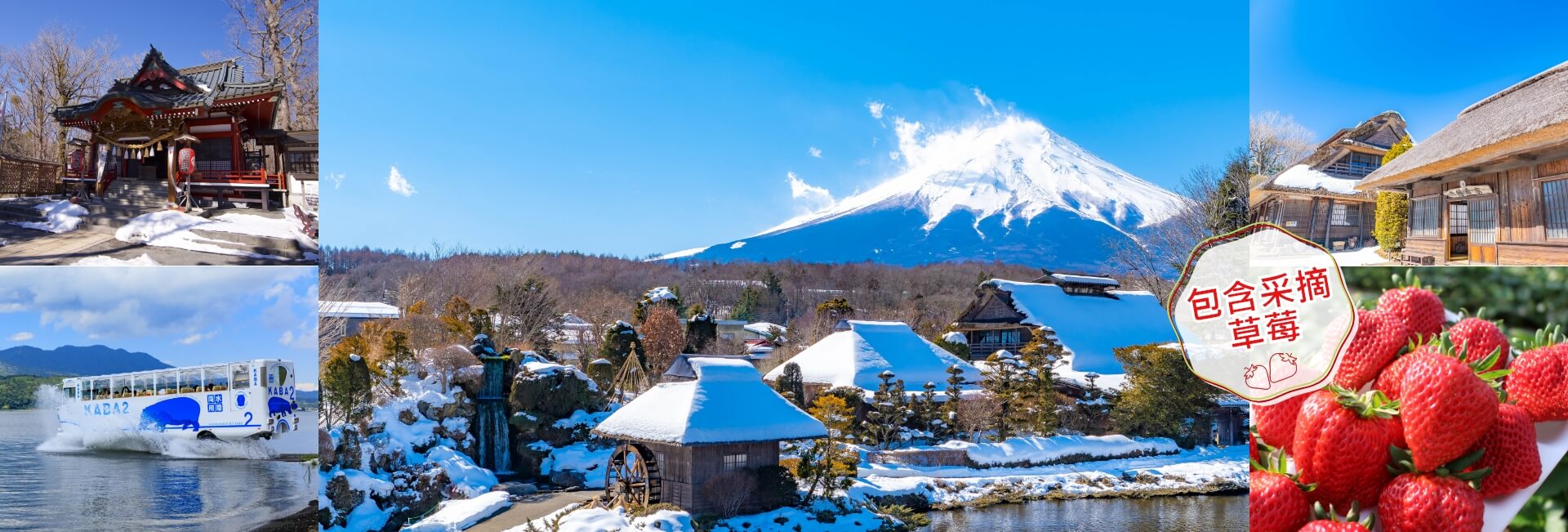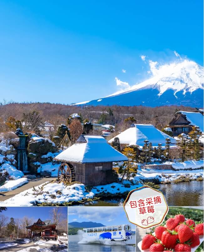 散步被受欢迎的富士山绝景胜地之一的忍野八海。是以富士山透明清澈的涌泉而闻名的美丽的地方。还可搭乘水陆两用巴士“KABA BUS”从山中湖上遥望富士山的雄伟景色。尽情欣赏雪景和富士山的美妙搭配。还有日本多汁美味的草莓采摘。