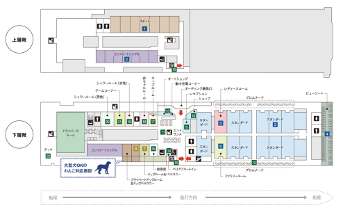 「Blue Mermaid」旨在配合客戶多元化的旅行風格,滿足各種客戶需求而設計。「標準艙」的空間比以往擴大了1.3倍,讓您能比以往更舒適地享受3小時40分鐘的休閒巡航。此外,船內採用無障礙設計,配備可容納擔架的電梯和救護室等,可用於多種目的。