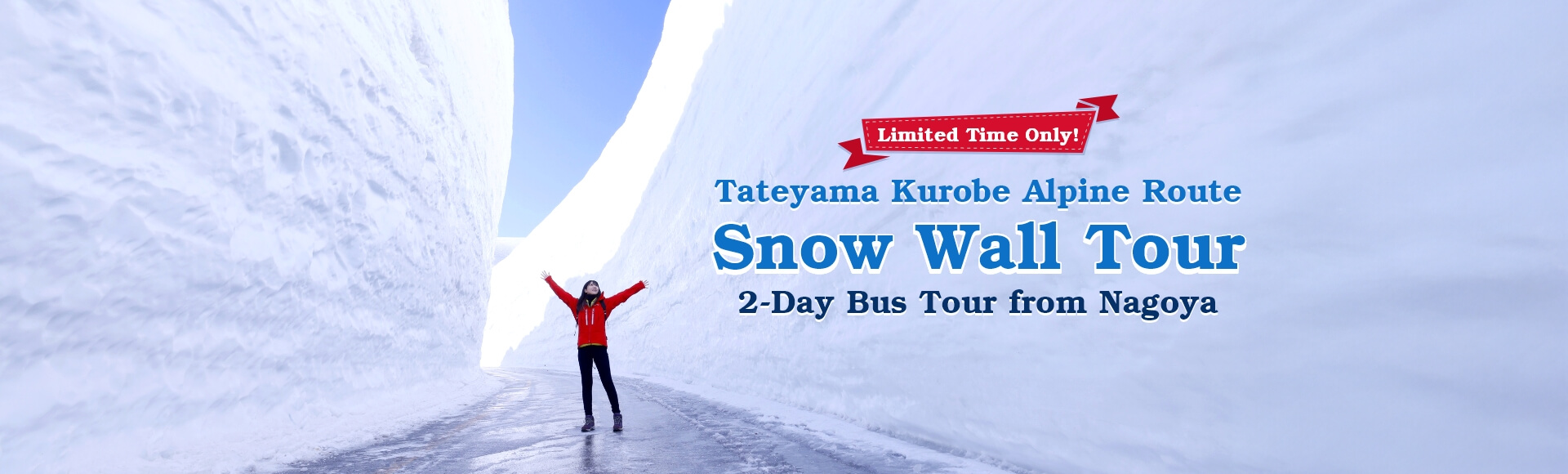 Experience the "Yuki-no-Otani" on this exclusive 2-day bus tour from Nagoya. Walk through Tateyama’s world-famous 20-meter snow walls—a breathtaking, mystical landscape where towering white canyons meet the brilliant blue sky.