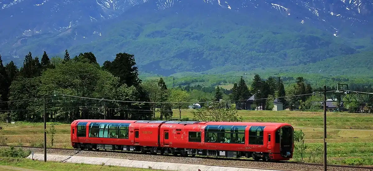 The body color of the TRAIN, manufactured in Niigata Prefecture, is "silver vermilion", which harmonizes with the untouched landscape of Japan.