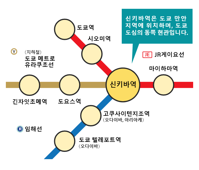 신키바역은 도쿄 만안 지역에 위치하며, 도쿄 도심의 동쪽 현관입니다.