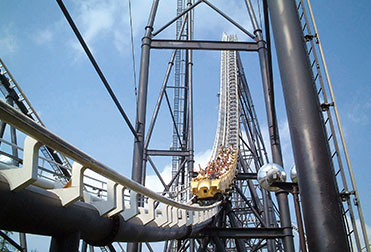 최대낙하각도 121°신・대형 롤러코스터! 수직나선형 낙하시에는 하늘을 바라보는 자세로 상승한 후 낙하하기 전에 한순간 정지합니다. 그리고 최대낙하각도 121°로 낙하하는 숨쉴틈없는 스릴있는 체험을 하실 수 있습니다.