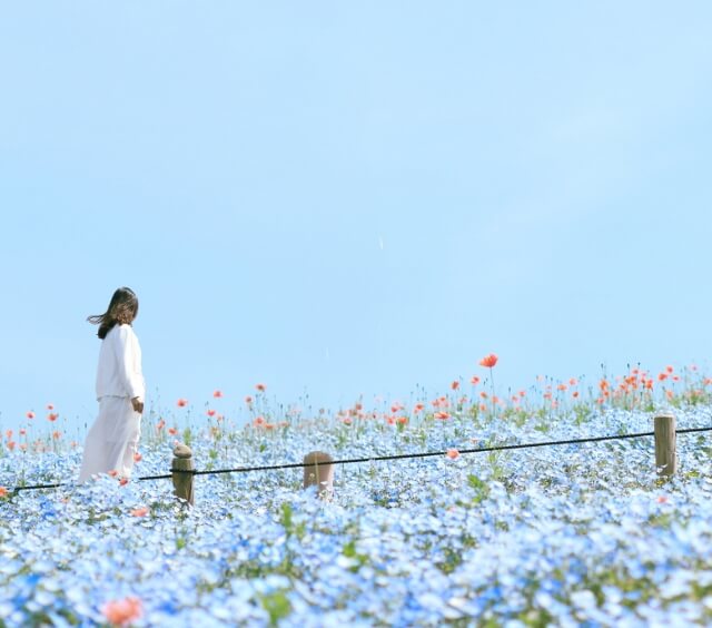 히타치 해변공원은 4월 하순부터 네모필라 꽃으로 물들기 시작하여 450만송이의 네모필라가 공원을 하늘색으로 물들입니다. 푸른 하늘과 이어진 푸른 물결과 같은 꽃밭을 걸으면 마친 하늘위를 걷는 것 같은 기분을 느껴보실 수 있습니다.