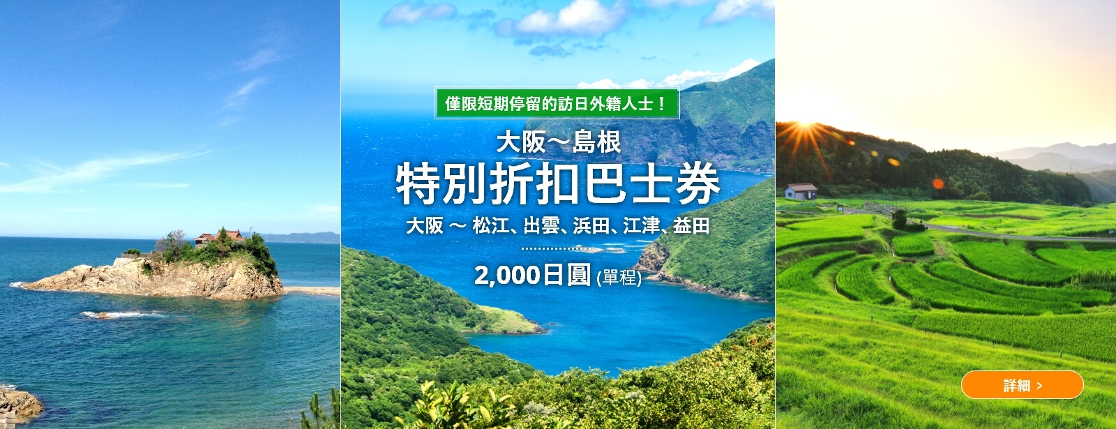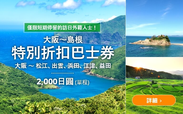 大阪-島根 特別折扣巴士券 大阪-島根 特別折扣巴士券