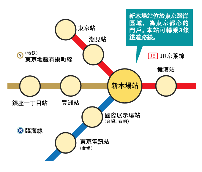 本站可轉乘3條鐵道路線,前往銀座、御台場、豐洲、潮見、舞濱、澀谷以及新宿等地皆十分便捷。